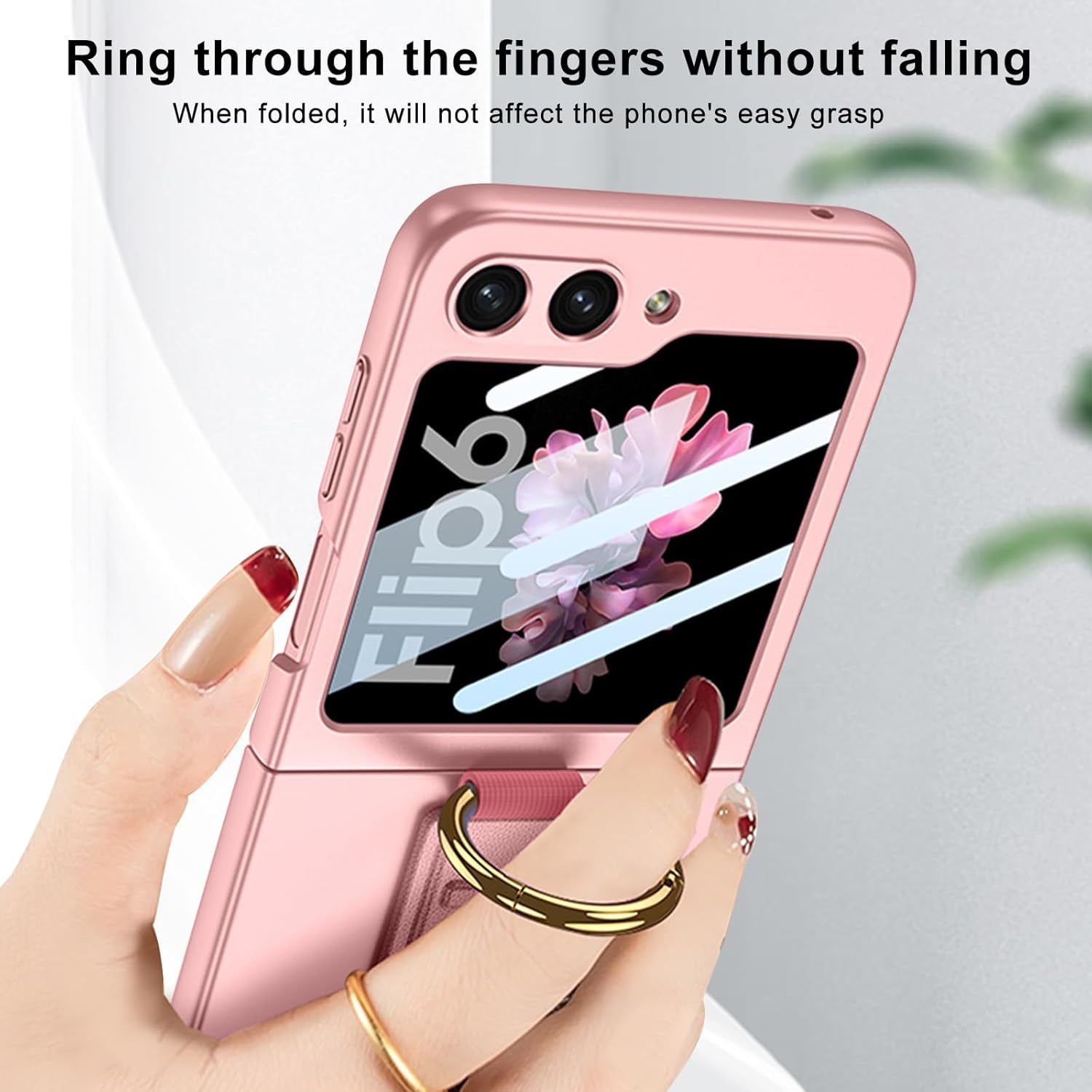 Mobizang Shockproof Band Protective Back Cover for Flip6 / Z Flip 6 | Wrist Strap Ring Kickstand Inbuilt Screen Tempered Glass Case (Pink)