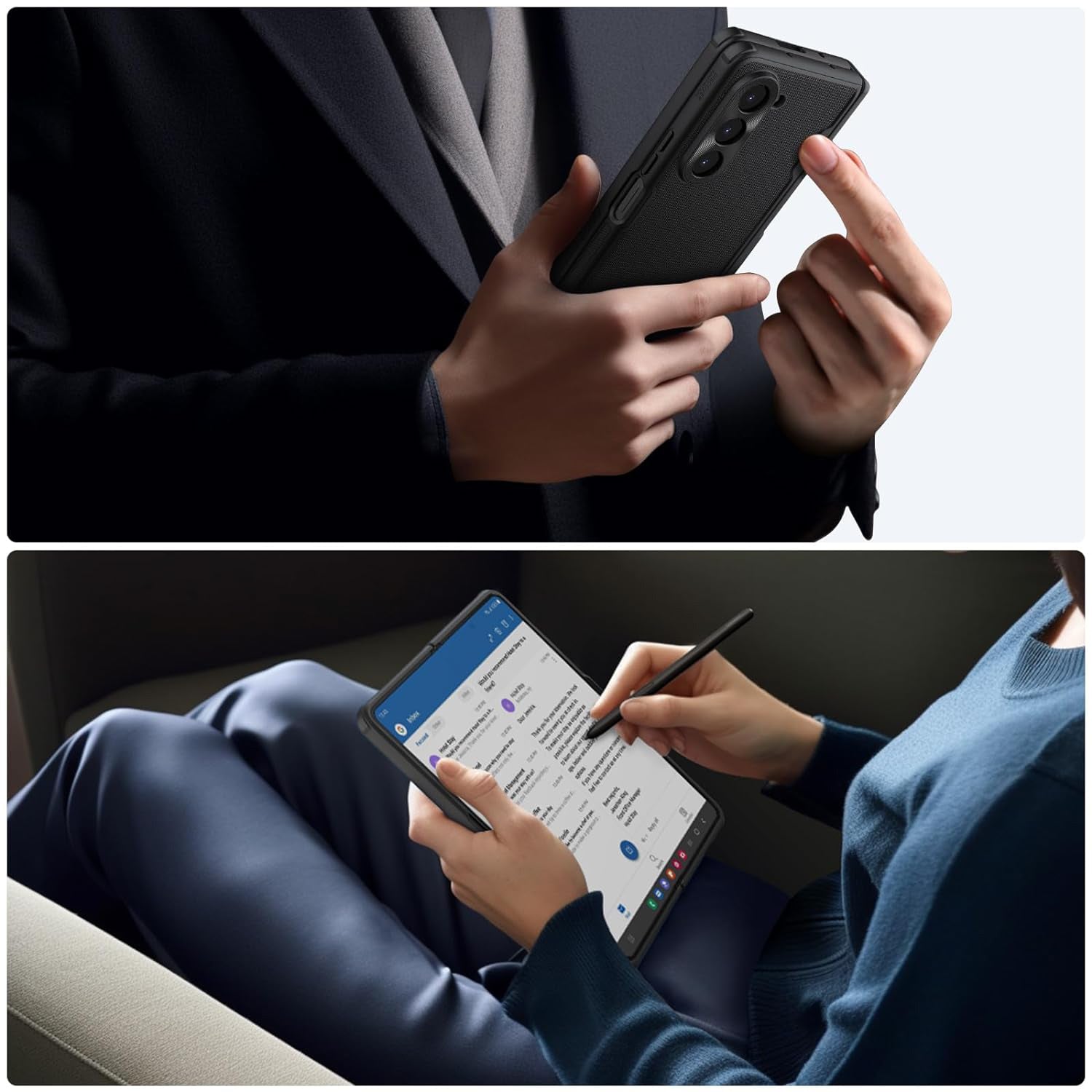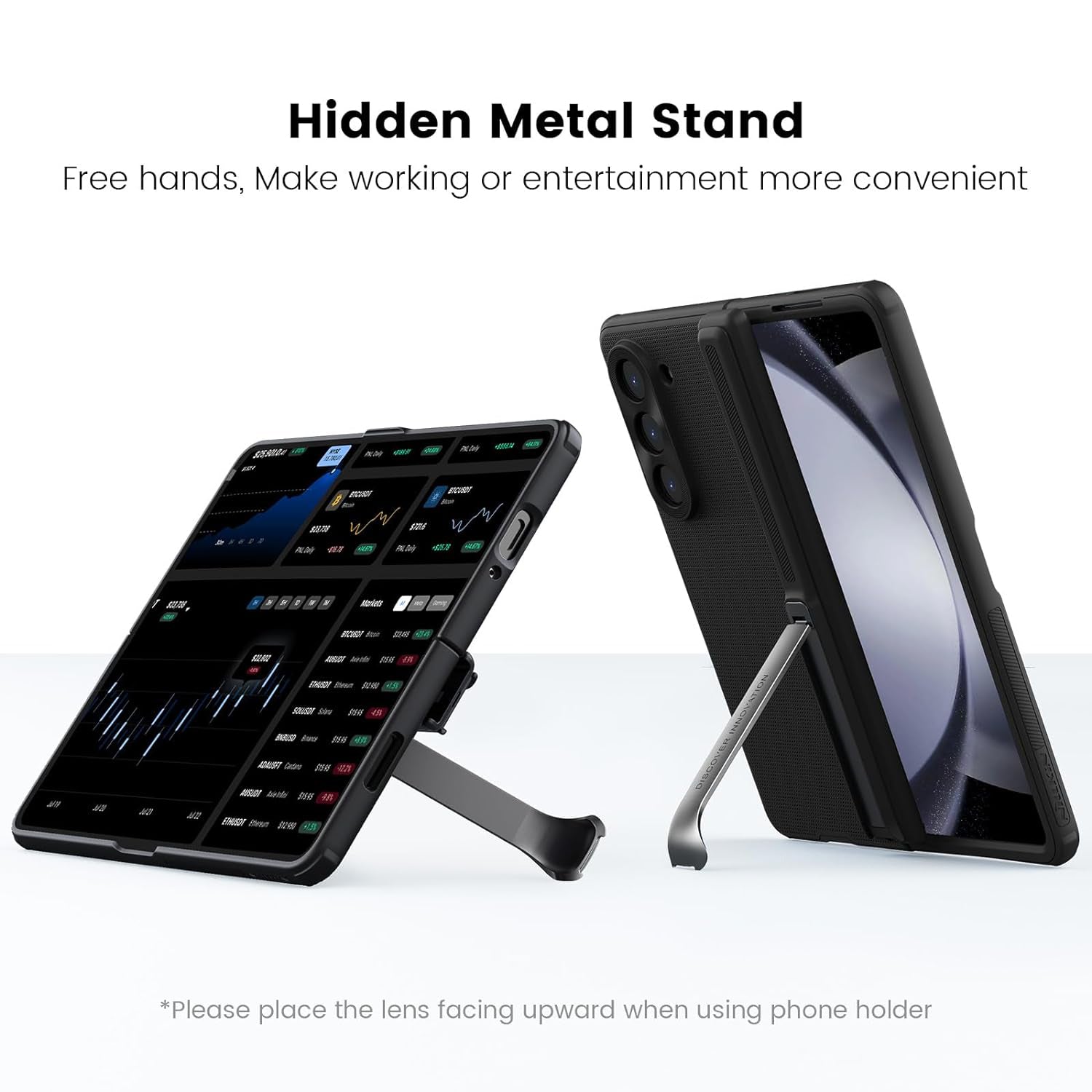 **Hidden Kickstand & Hinge Protection - Hidden phone stand to free hands, supports both vertical and horizontal viewing. make working or entertainment more convenient. Also protects the hinge of your Galaxy Z Fold 5